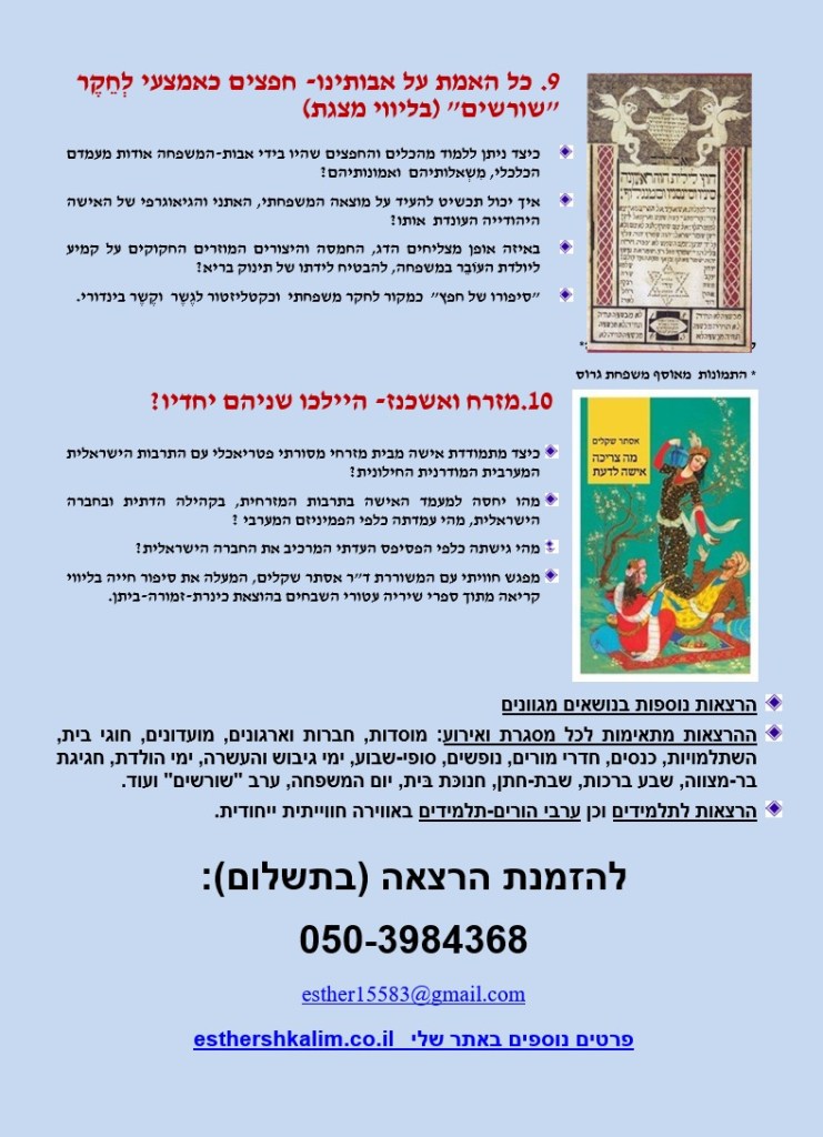 - ההרצאות מתאימות לכל מסגרת ואירוע: מוסדות, חברות וארגונים, מועדונים, מתנ"סים, חוגי בית, השתלמויות, כנסים, חדרי מורים, נופשים, סופי-שבוע, ימי גיבוש והעשרה, ימי הולדת, חגיגת בר-מצווה, שבע ברכות, שבת-חתן, חנוכּת בּית, יום המשפחה, ערב "שורשים" ועוד.